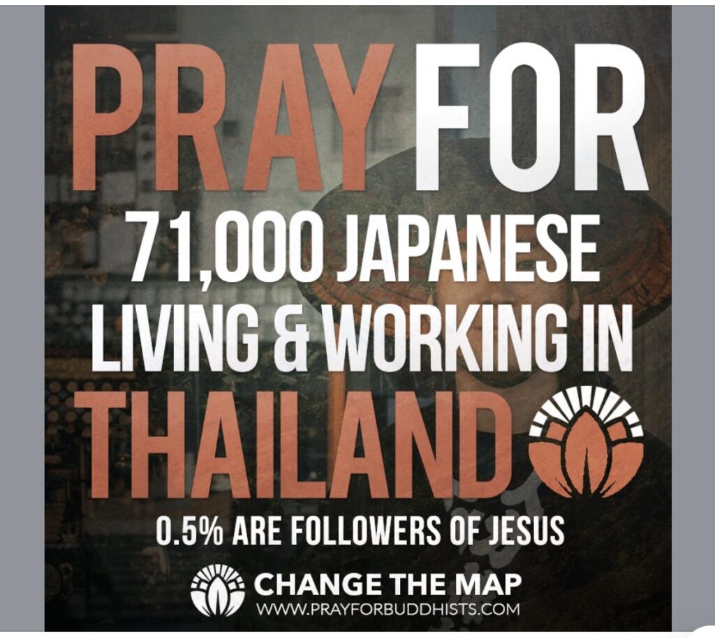 (From Change the Map: Prayer For the Buddhist World) Pray for the 71,000 Japanese in Thailand Approximately 0.5% follow Jesus. Many Japanese have moved to Thailand because it provides an offshore base for their export-oriented industries. The Japanese live in… Read moreDon’t Let This Minority Be Overlooked!