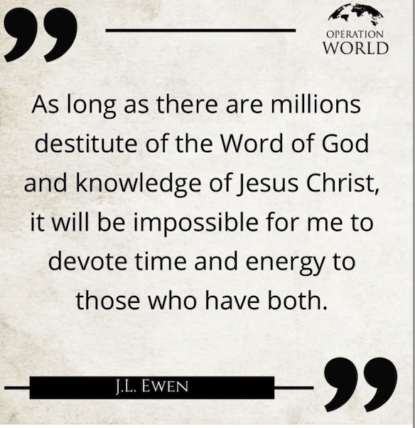 J.L. Ewen (1855-1924) was a pioneering missions mobilizer and worked primarily in Argentina. Most of his time was spent spreading the Gospel. He is remembered, not just for this quote, but for his enthusiasm and urgency in spreading the Gospel… Read more42% Of The World Has Yet To Hear About Jesus